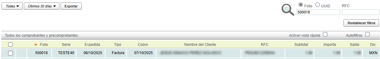 Invoices from the last 30 days will be displayed with the default filters. To the right of the filters, you will find search boxes for folio and/or RFC. To use them, click on one of them and type the folio number or RFC, then press Enter. You don't need to type the entire folio or RFC; by typing only part of it, the system will search for invoices that match your search. If you wish to remove the search filters, click the "Restablecer filtros" button.