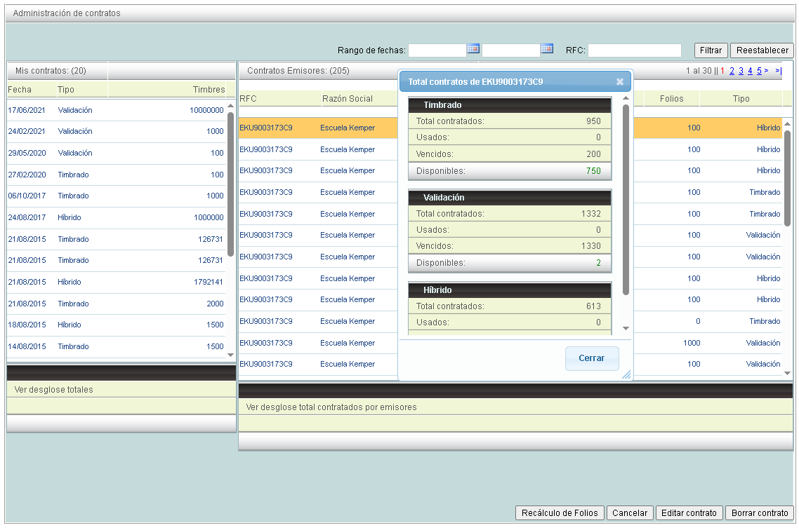 The contracts for each issuer will be displayed, and in the lower left corner click on "Ver desglose totales" and in the window you can see the total number of contracted, used, and available stamps.